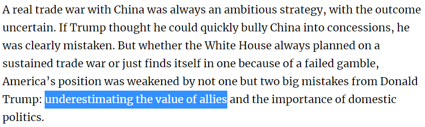 @BulwarkOnline in Oct Bailing on TPP, ditching the anti-China containment strategy, and being a jerk to allies--instead of confronting China as a bloc--undermined the trade war from the start. It sucks, but can't just reverse it now.pic.twitter.com/XhHz7GGFfC