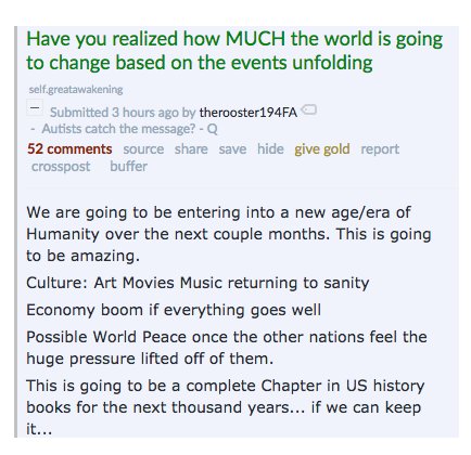 There's a lot of that going around. At the risk of both sidesing this somewhat, I've seen quite a few "we're in the know and part of the vanguard" from anti-Trump online groups. Mueller has him with Putin on tape! He's resigning this week! Etc., etc.