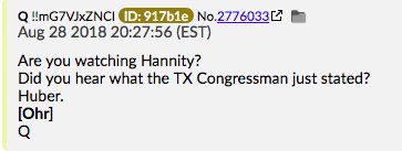 Q kept posting up a storm, 38 drops for Monday alone. That includes this gem: "Are you watching Hannity? Did you hear what the TX Congressman just stated?" For messages from someone with high level clearance, these sure sound like texts from a 60-something Fox News dad.pic.twitter.com/QinVeAdztC