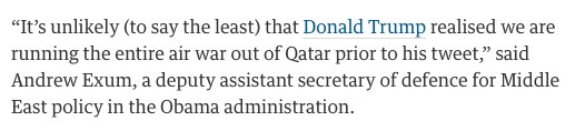 “It’s unlikely (to say the least) that Donald Trump realised we are running the entire air war out of Qatar prior to his tweet,” #trump2016pic.twitter.com/O2nkyJ7wfP