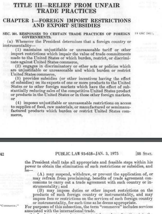 Here it is, the law giving POTUS the power to impose tariffs: Trade Act 1974, Section 301 (hat tip