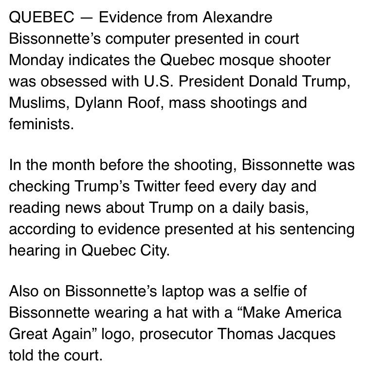 Perpetrator of Quebec City mosque massacre was a Trump devotee, took a selfie wearing a MAGA hat, closely followed personalities from Breitbart and Fox News, court is told. http://montrealgazette.com/news/local-news/quebec-mosque-shooter-alexandre-bissonnette-trawled-trumps-twitter-feed … pic.twitter.com/PSfXmdqZay