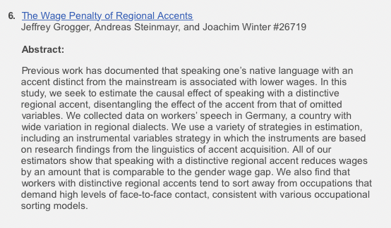 Having the wrong accent – even in one’s native country – sets you up for a wage gap comparable to the gender wage gap http://papers.nber.org/papers/W26719?utm_campaign=ntwh&utm_medium=email&utm_source=ntwg21 …pic.twitter.com/dusvAhlqbx