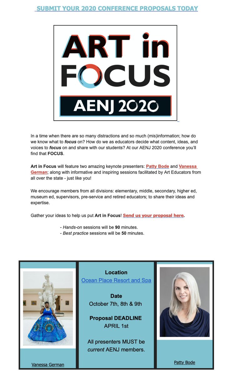 #AENJ #2020#CONFERENCE#PRESENTATION &#WORKSHOP#PROPOSALS - Deadline APRIL 1st#ArtInFocus2020 http://ow.ly/4Yhb50xYXnQ pic.twitter.com/iLukrms4Uo