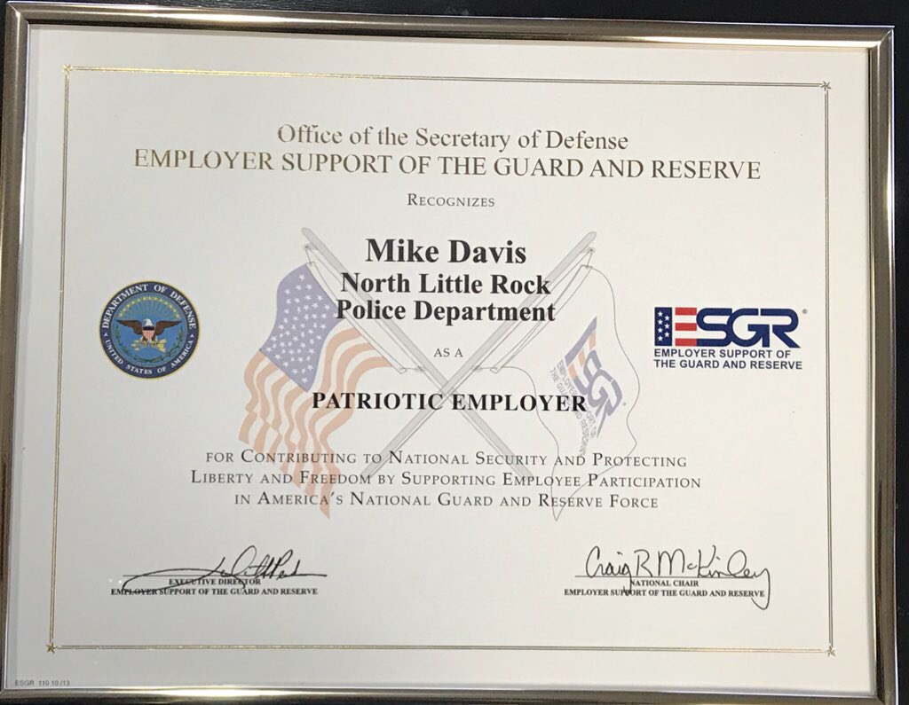 Allan Qualmann the Employer Outreach Coordinator (Arkansas) for the Employer Support of the Guard & Reserve presented Chief Mike Davis & your NLRPD with an award as a Patriotic Employer, for supporting employee participation in the Guard & Reserve Program.
