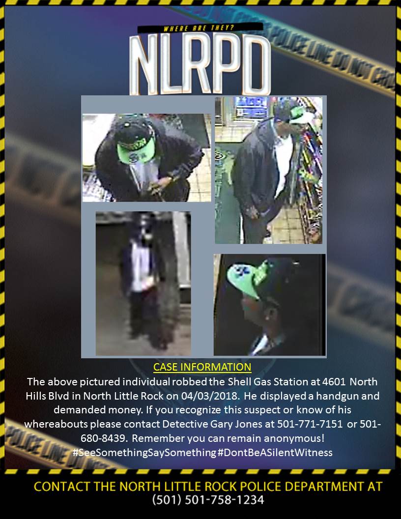 Pls Retweet - The pictured individual robbed the Shell Gas Station @ 4601 N. Hills Blvd in NLR on 04/03/2018. During the robbery he displayed a handgun & demanded money. If you recognize this suspect or know of his whereabouts, contact Det. Jones @ 501-771-7151 or 501-680-8439.pic.twitter.com/ZpSCkgtVdP