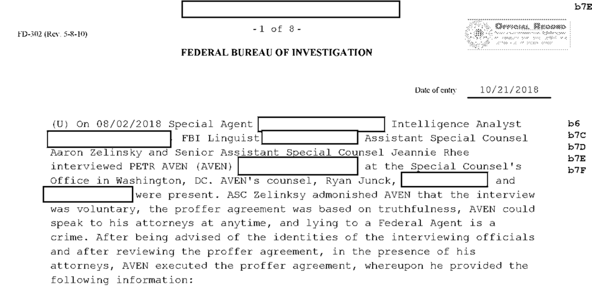 In October 2018, Pyotr Aven of Alfa Bank entered into a proffer agreement with Mueller's team in an interview where he discussed the Alfa Bank - Spectrum Health - Trump email server communications. I don't believe you proffer unless there's a risk of prosecution.https://twitter.com/soychicka/status/1218380690057723904 …