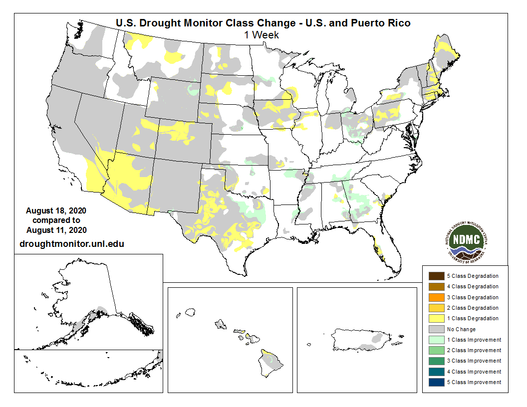 #DroughtMonitor 8/18: This week’s change map shows mostly deteriorating conditions for areas already experiencing#drought, such as the Northeast, Western PA, IA, and much of the West. Improvements in the Southeast and a few other spots. See http://drought.gov@NOAApic.twitter.com/WpvVepK6sW