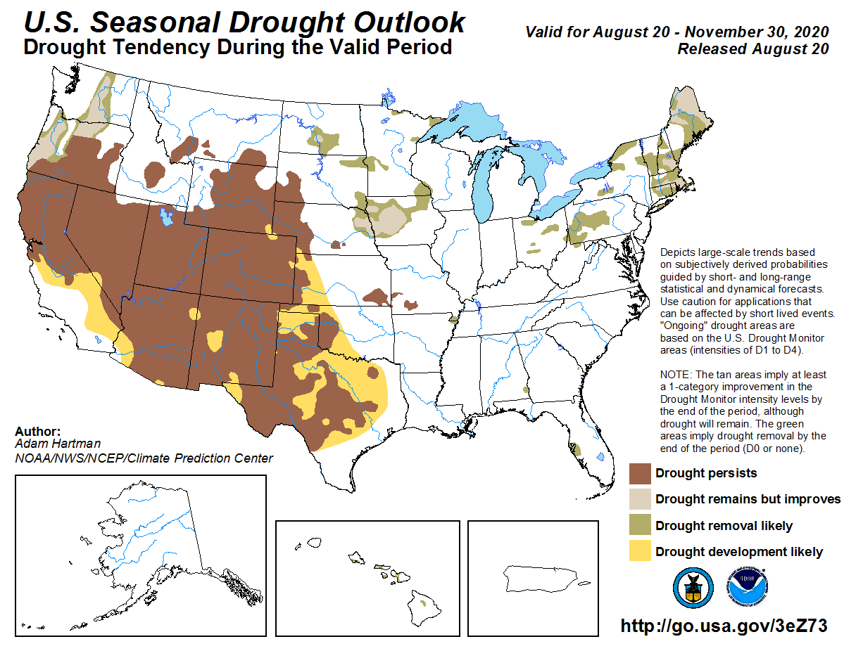 #DroughtMonitor 8/18: Looking further out,@NOAA’s@NWSCPC Seasonal Outlook shows that the#drought in the West may be with us for some time. and may in fact, expand. Areas that may improve? Northwest, Northeast, Midwest, parts of the N. Plains, HI. See http://cpc.ncep.noaa.gov/products/expert_assessment/sdo_summary.php …pic.twitter.com/OFhNOK7K9V