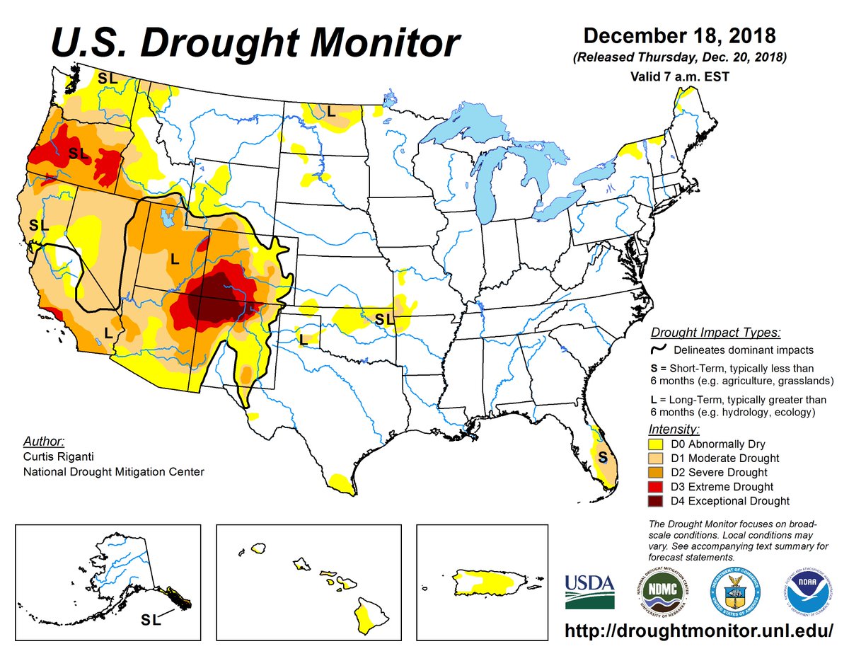 #DroughtMonitor 12/18: Minor adjustments in OK & TX panhandles, far south TX & FL. Otherwise little change from last week. Precip on#drought-stricken West Coast will be reflected in next week’s map. http://drought.gov#Drought2018pic.twitter.com/E56KucDYbC