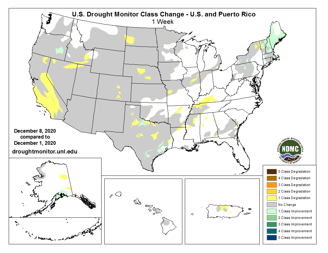#DroughtMonitor 12/8: The Southwest (except CA) is status quo in this week’s change map even after another dry week. Why? Because there’s no level worse than Exceptional Drought (D4). On a good note, the Northeast saw more improvements and parts are now#drought-free.@NOAApic.twitter.com/pQdNxYYGrj