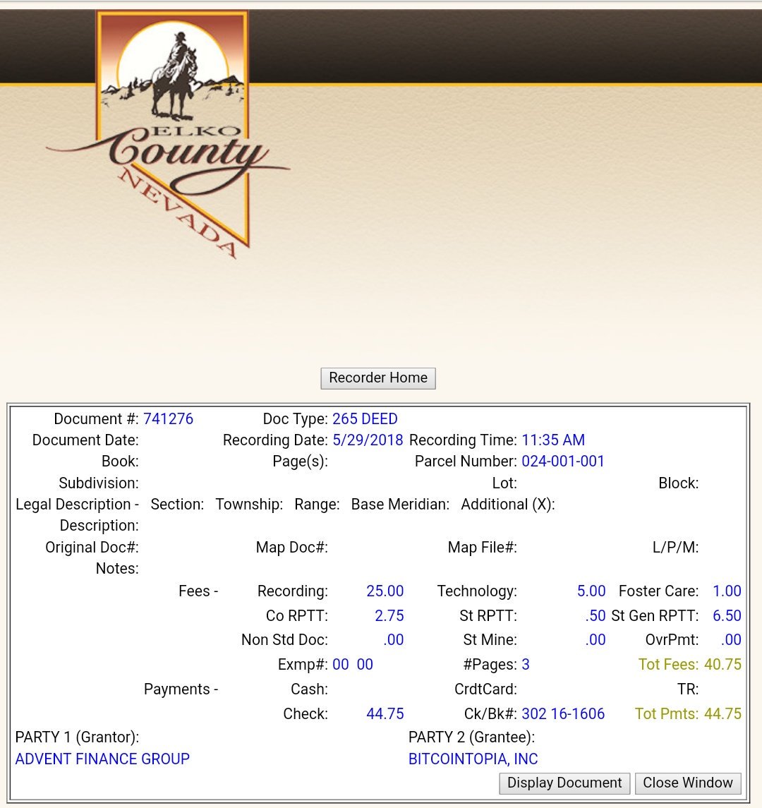 First #Bitcointopia deeds is now online & recorded at the Elko County Recorder.