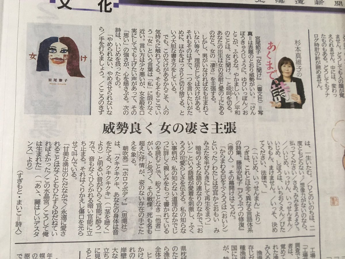 ◾︎本日12月18日の北海道新聞夕刊(全道版)、杉本真維子さんの詩集評、宮尾節子さん『女に聞け』(響文社)が大きく! 「威勢よく 女の凄さ 主張」pic.twitter.com/nVX6pfWWRZ