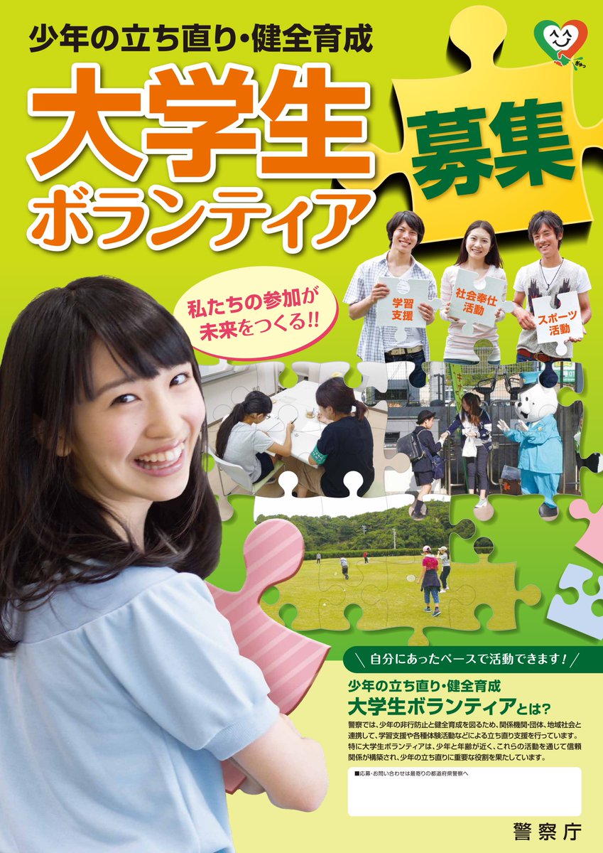 【少年の立ち直り・健全育成大学生ボランティア募集!】 少年の安全に関するお知らせに、広報資料を掲載しました。 詳しくは、リーフレットに掲載されている各都道府県警察にお問い合わせください。https://www.npa.go.jp/safetylife/syonen/volunteer/leaflet.pdf …pic.twitter.com/4Q6QJaR5uT