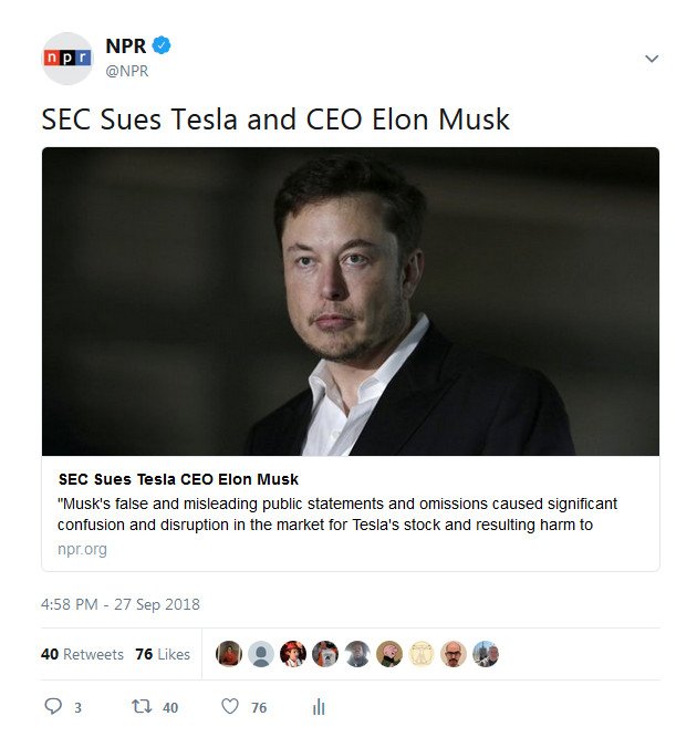 This corrects an earlier tweet that incorrectly said the SEC had sued Tesla as well. Musk is the only party named in the lawsuit.pic.twitter.com/QMlSYegtun