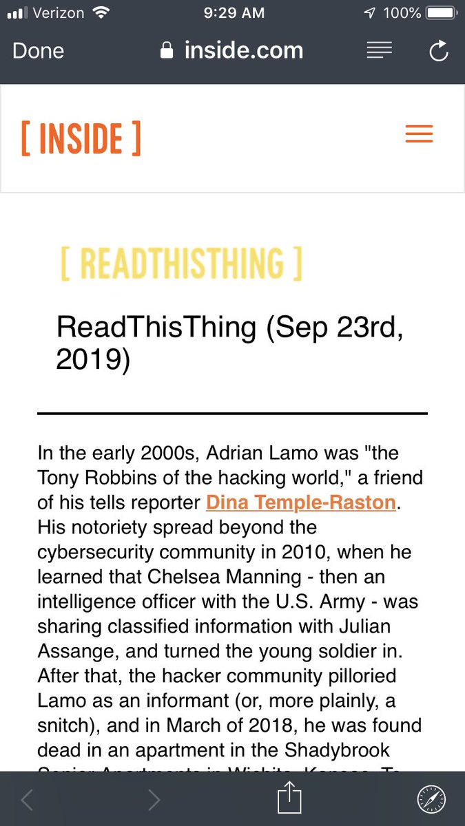 @dlippman for naming our Adrian Lamo story one oh his “Great Weekend Reads.” If you missed it, you can read or listen here: https://www.npr.org/2019/09/19/760317486/the-mysterious-death-of-the-hacker-who-turned-in-chelsea-manning …pic.twitter.com/pAEcQlh38o