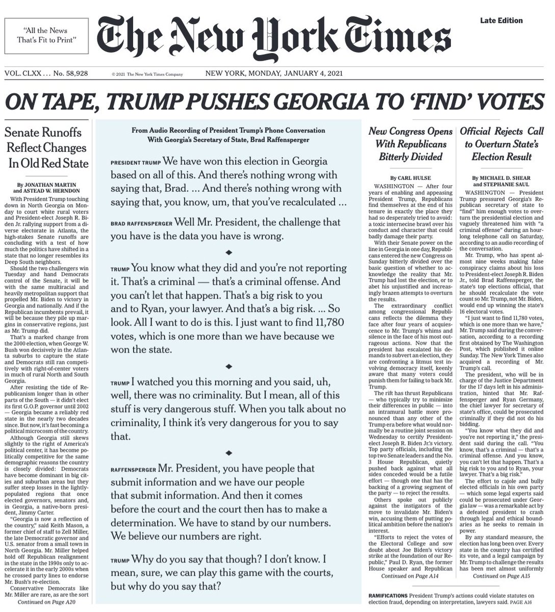 There are no words to describe the experience of listening to 50 minutes of a POTUS pressuring a state official to "recalculate" election results. Having heard a lot of LBJ tapes & a lot of Nixon tapes, these are not virgin ears. And yet, this is an experience like no other.