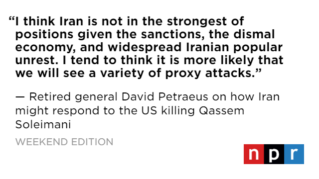 We spoke with retired general David Petraeus this morning about tensions between the US and Iran. https://www.npr.org/2020/01/05/793722592/david-petraeus-on-soleimani …pic.twitter.com/nrar18uXm7
