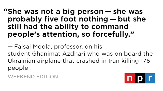 2/ One of those lives lost was Ghanimat Azdhari who was pursuing her Ph.D at the University of Guelph in Ontario. She was one of many international students returning to Canada from the holidays. Hear our conversation with her professor: https://www.npr.org/2020/01/11/795514822/remembering-ghanimat-azhdari-student-killed-in-plane-crash …pic.twitter.com/epoiIIhISq