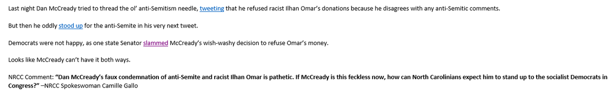 NRCC on the McCready refund: “Dan McCready’s faux condemnation of anti-Semite and racist Ilhan Omar is pathetic. If McCready is this feckless now, how can North Carolinians expect him to stand up to the socialist Democrats in Congress?”