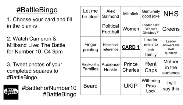 Clegg's not in #BattleForNumber10, so @BBCFreeSpeech's #BattleBingo it is! (We're going with Card 3)pic.twitter.com/2TBXvZKGOT