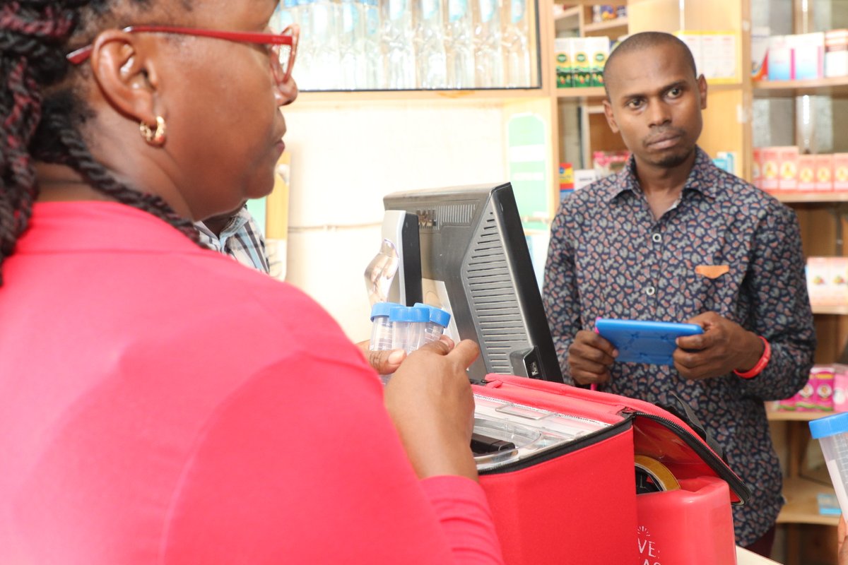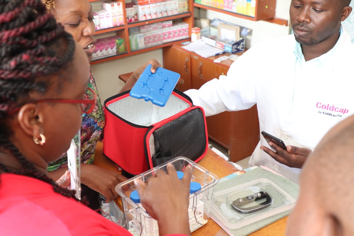 Mercy Nyangaresi, TB REACH program Manager providing falcon tubes, cartridges and cool boxes to selected private health facilities and chemists in Machakos county. DNTLD-P is using innovative ways to enable access to TB services in Kenya