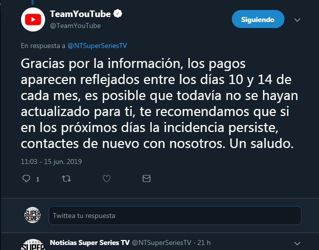 Hola de Nuevo @TeamYouTube me comunico nuevamente como me habían recalcado, LLEGO día 15 y mi dinero que hice en mayo no me lo abonaron a mi cuenta de Adsense YA HOY ES 16 Y TAMPOCO SE REFLEJA MI DINERO HICE MAS 2MIL$$ por favor solicito ayuda, necesito SOLUCIÓN Gracias!!!pic.twitter.com/4MTTqNRDZ2