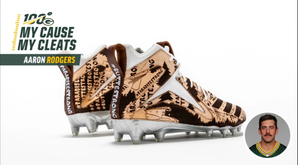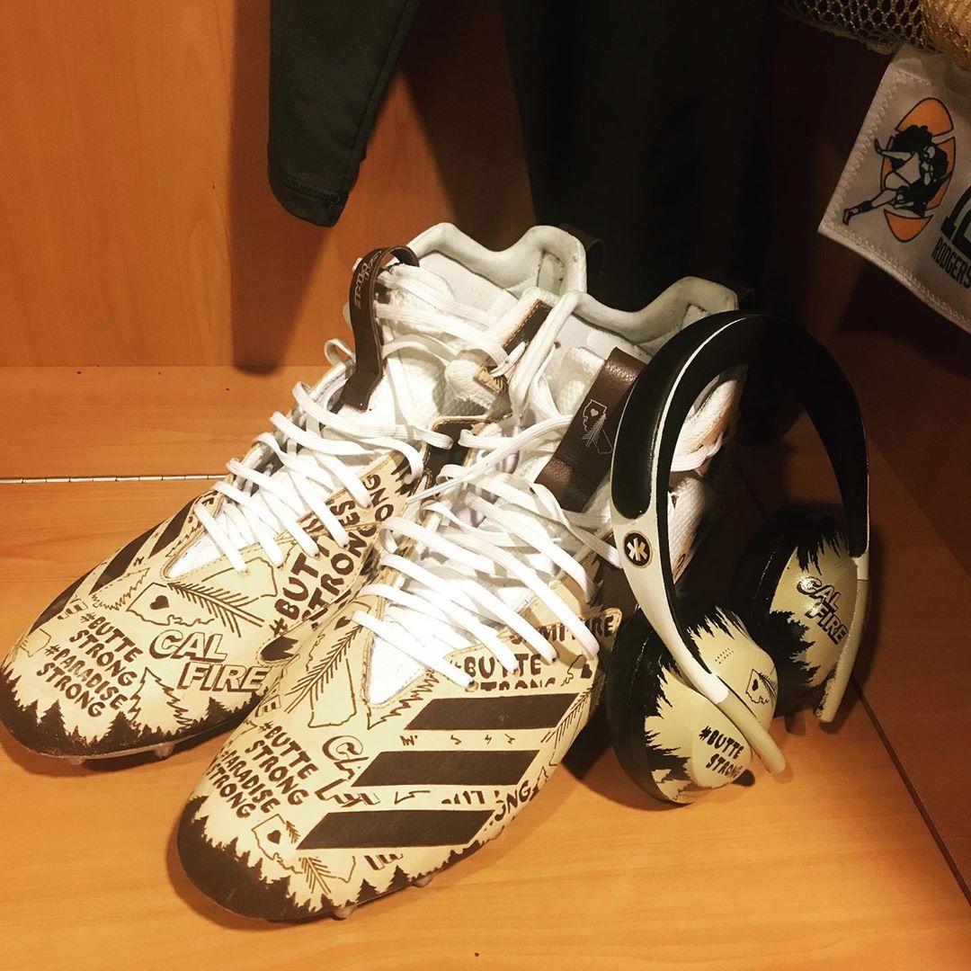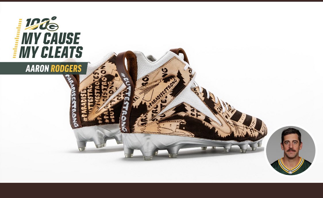 @AaronRodgers12 showing his continuing support for@NVCF,@CountyofButte and@CAL_FIRE. He'll wear the cleats during tomorrow's game as part the#MyCauseMyCleats campaign. Rodgers made a $1M donation to relief efforts last year.#buttestrong#paradisestrongpic.twitter.com/ou8ojIUNDf