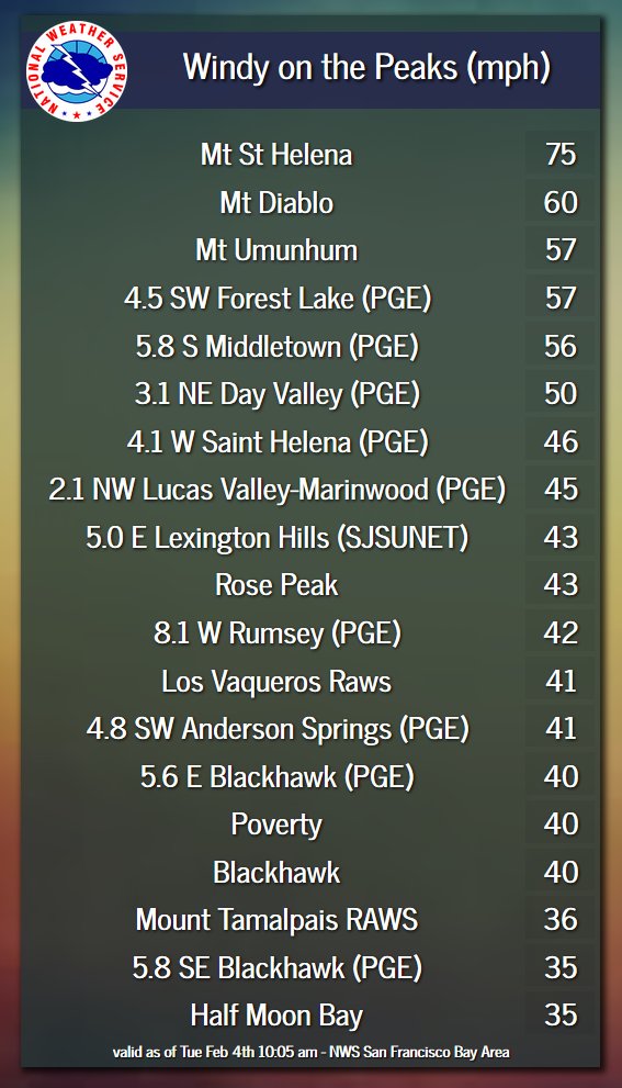 Believe it or not, Mt St Helena gusted to 75mph around 720am this morning! https://www.wrh.noaa.gov/mesowest/timeseries.php?sid=PG132&num=72&banner=gmap&raw=0&w=325 … Many peaks and coastal locations are also reporting gusts this morning. The graphic shows all locations with gusts >= 35mph in within the last 12 hours.pic.twitter.com/lvuOnEw4H3