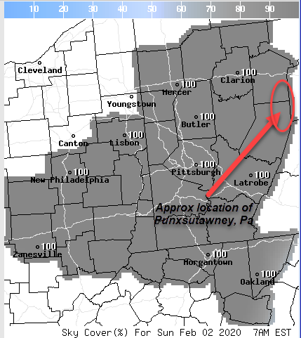 Will the groundhog see his shadow morning? It's looking unlikely. Cloud cover is expected to persist through the morning hours as noted by the cloud cover forecast for 7am. Even with all that said, we'll just have to wait and see what the groundhog says.pic.twitter.com/RAT32prGFv