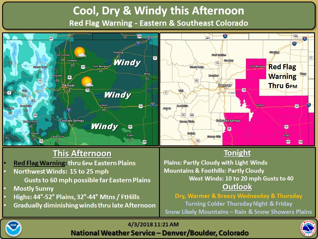 Strong NW winds w/ gusts to 60 mph possible over far eastern CO this aftn. Red Flag Warning: Eastern Plains thru 6pm. Diminishing winds by evening.