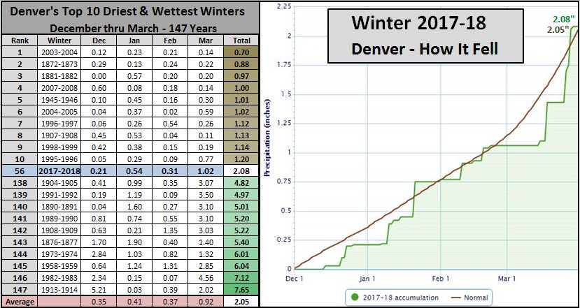 Denver's Top 10 Driest & Wettest winters (Dec thru Mar). Winter 2017-18 ranked 56th driest (about in the middle). Cool & unsettled wx in late Mar helped keep most of the Front Range area on track.