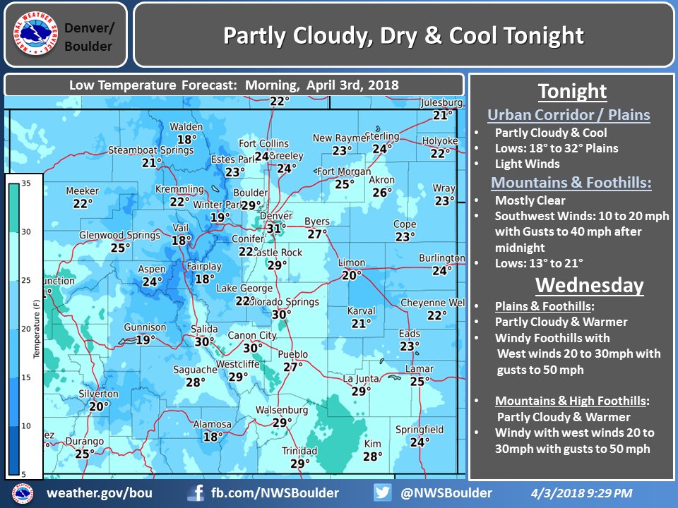 Partly cloudy & cool tonight. Winds will be light on the plains with gusty winds to 40 mph possible higher mountain passes & above timberlinpic.twitter.com/pNTH5Ec5N0