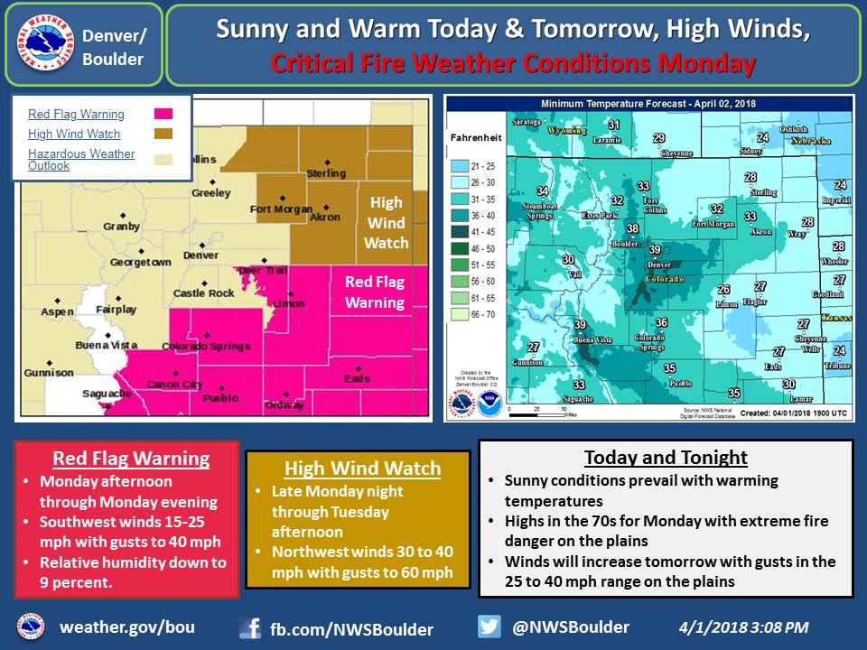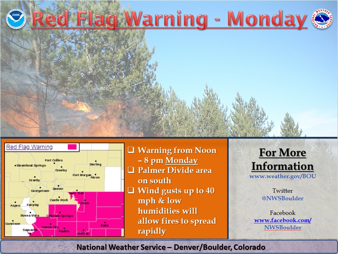 Red Flag Warning has been issued for areas along the Palmer Divide and southward from noon until 8 pm Monday. Low humidities down to 9% and sustained wind speeds of 15 to 25 mph with gusts up to 40 mph will allow fire starts to increase rapidly.