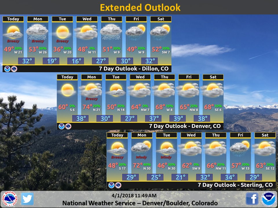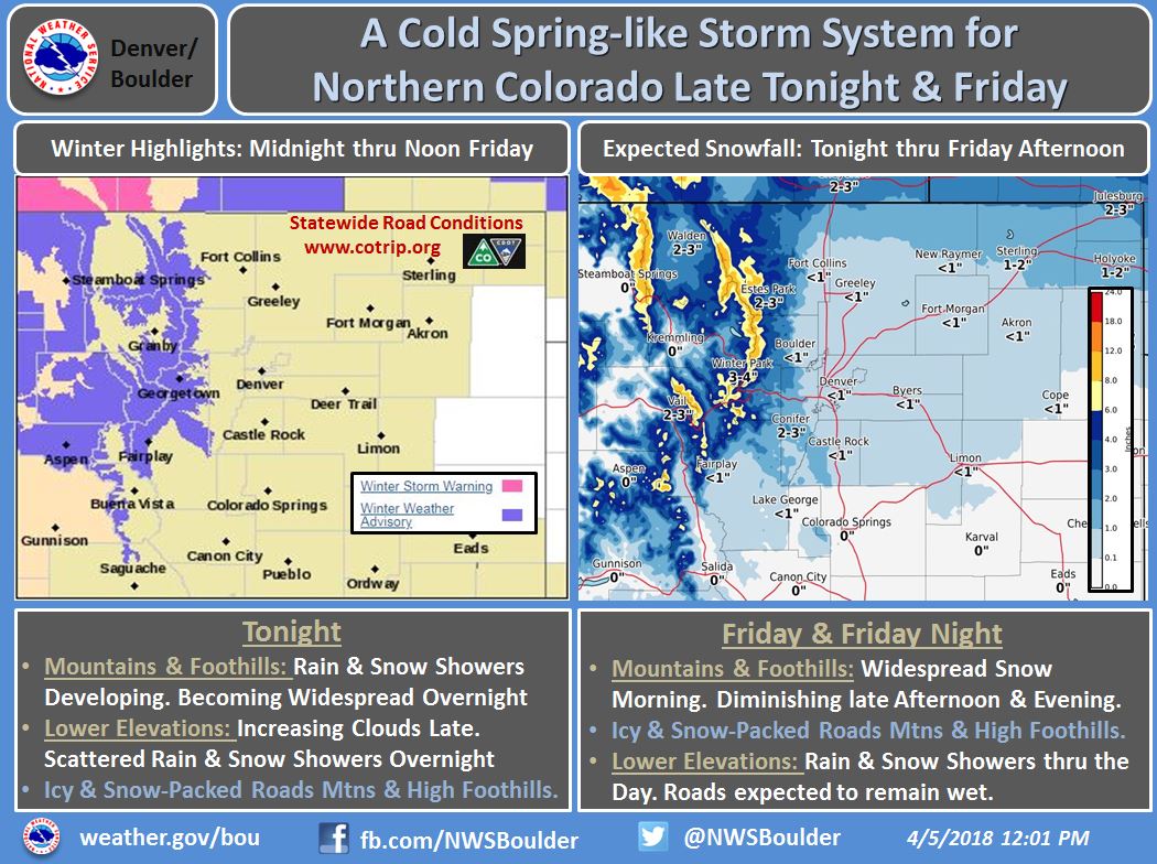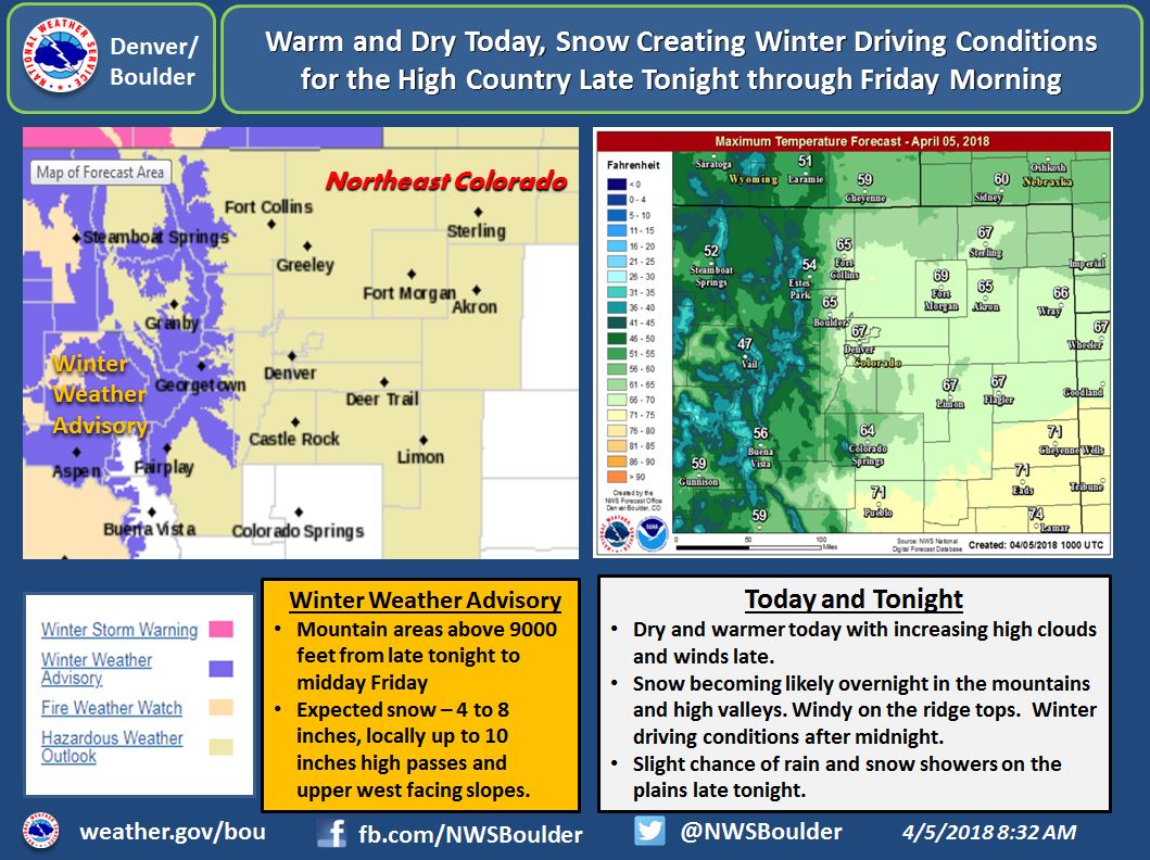 Warm conditions for this afternoon ahead of an approaching cold spring-like storm system late tonight & Friday. 4"-10" Mtns & FtHills w/around 1" Plains.