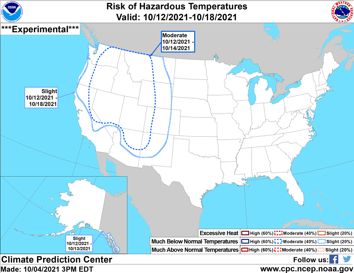 Much below-normal temperatures appear likely for much of the western U.S. during October 12th through 14th. https://www.cpc.ncep.noaa.gov/products/predictions/threats/threats.php …pic.twitter.com/vSMrXDjZs1