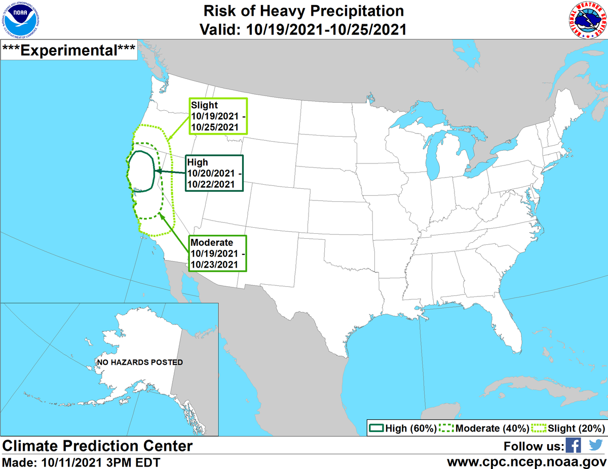 A high risk for heavy precipitation is forecast on October 20th through 22nd across much of Northern California for rainfall that could raise burn scar flooding concerns, but also help replenish reservoir levels. Our Week-2 hazards outlook has the latest: https://www.cpc.ncep.noaa.gov/products/predictions/threats/threats.php …pic.twitter.com/oUKat0JlkW