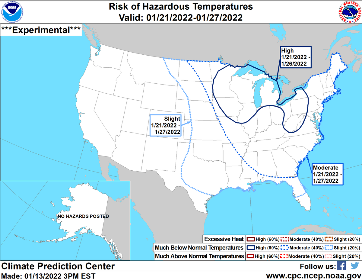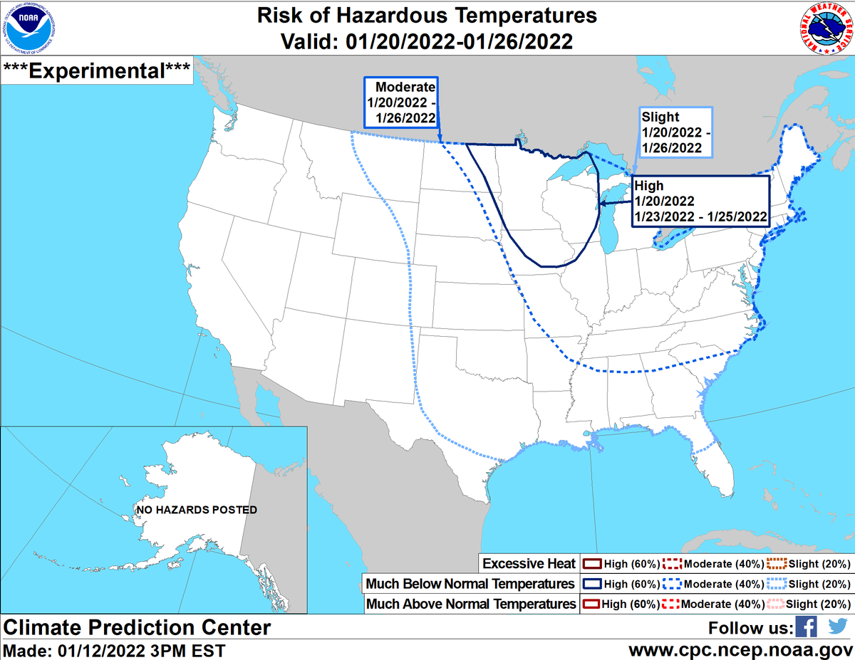 High risk of much below normal temperatures for much of the eastern United States next weekend into early the following week. Parts of the Eastern Seaboard may experience its coldest temperatures of the winter season so far. https://www.cpc.ncep.noaa.gov/products/predictions/threats/threats.php …pic.twitter.com/y3cVk1dTiz