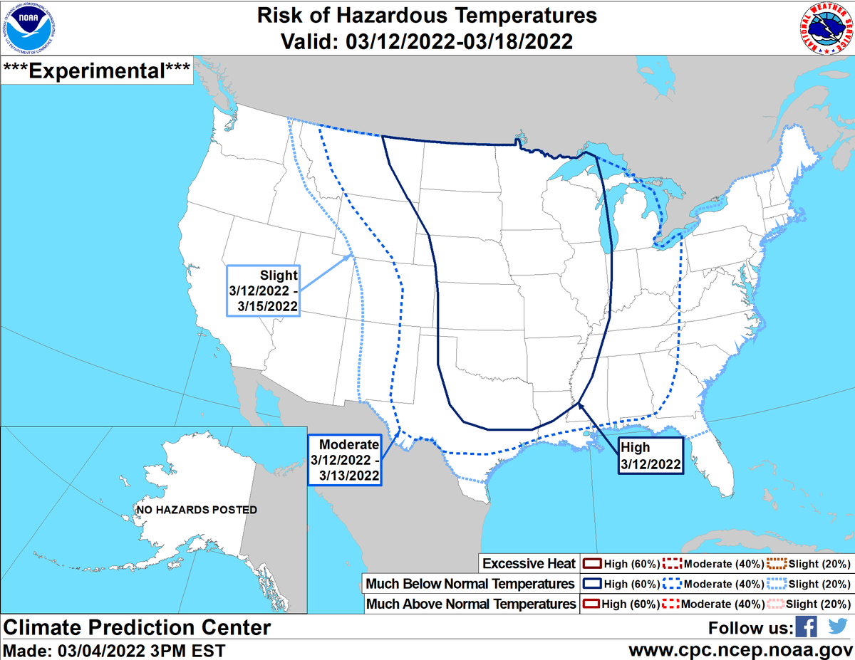 We anticipate a high risk of much below-normal temperatures across much of the Central U.S. on the 12th of March. Daily record low temperatures are possible throughout the highlighted region. https://www.cpc.ncep.noaa.gov/products/predictions/threats/threats.php …pic.twitter.com/fGGJoYRijt