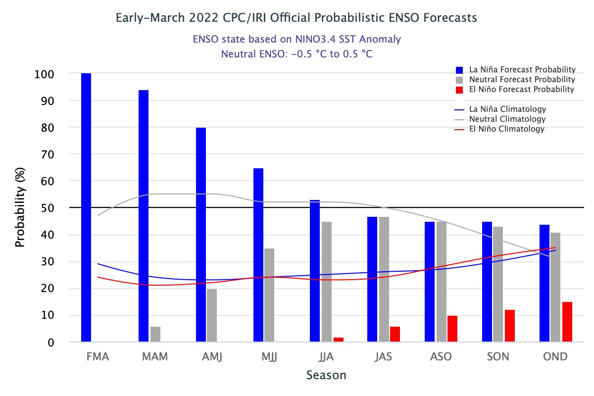 La Niña is favored to continue into the Northern Hemisphere summer (53% chance during June-August 2022), with a 40-50% chance of La Niña or ENSO-neutral thereafter. A