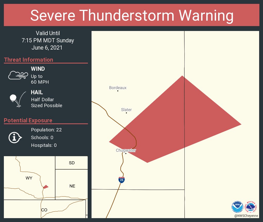 Severe Thunderstorm Warning including Chugwater WY until 6:45 PM MDTpic.twitter.com/hBxv50FKVP