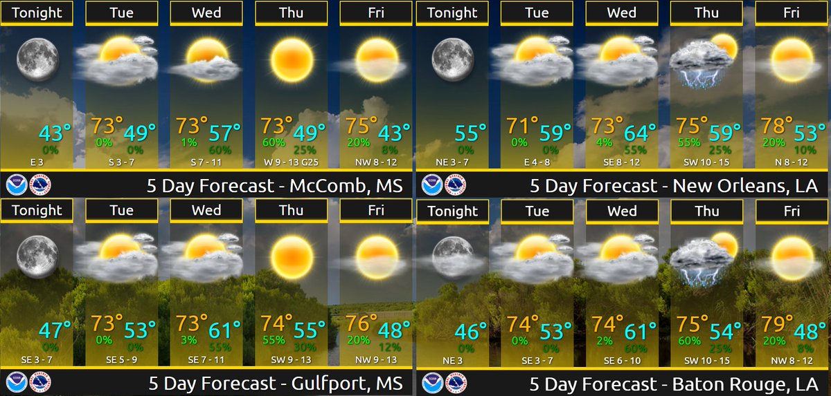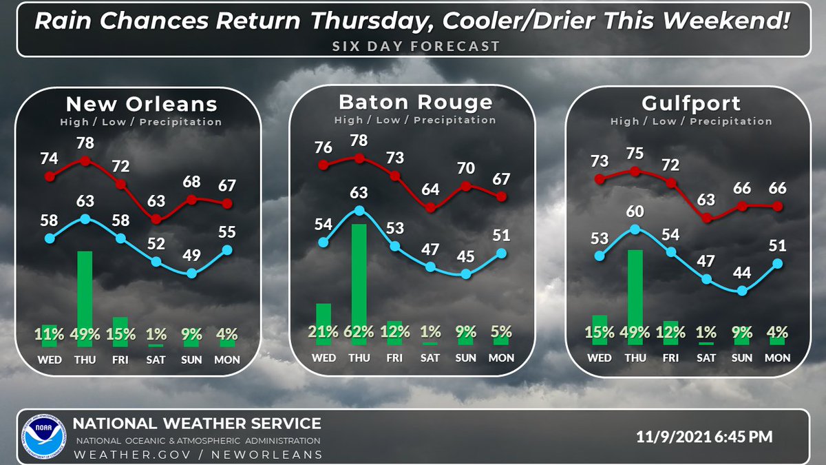 Quite the comfortable day across the region today with most of the region in the lower to mid 70s under sunny skies. Only locations that struggled to get into 70s were right along the coast like coastal MS & extreme SELA.