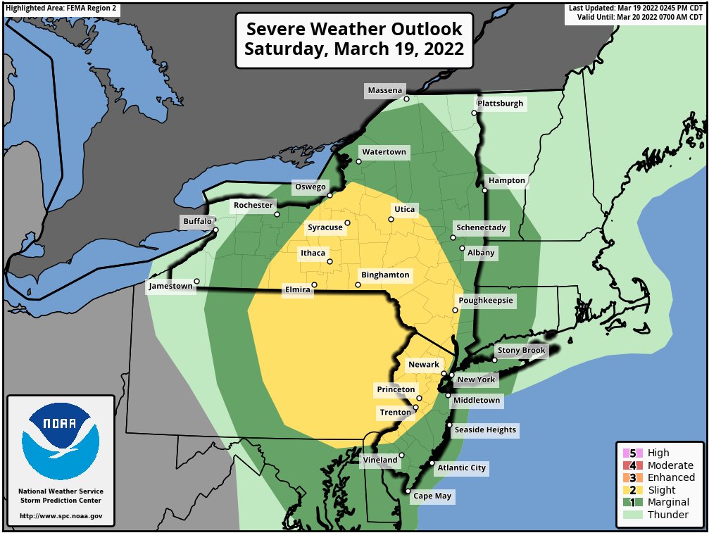 Areas basically west of the Hudson River remain in the Slight Risk for severe weather this evening. Marginal or lower elsewhere.