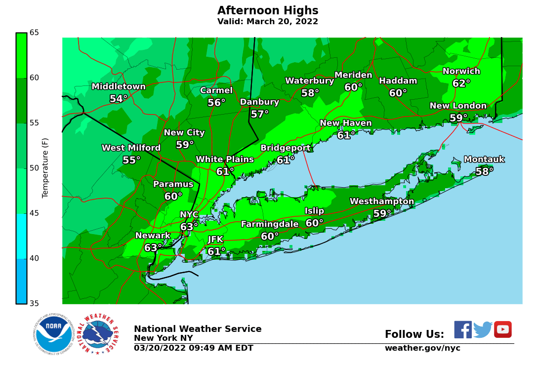 High pressure starts to build into the area today. As a result, expect dry and sunny conditions with temperatures in the 50s and lower 60s. Winds will increase this afternoon with gusts to 20-25 mph. Visit http://www.weather.gov/nyc for all the details.