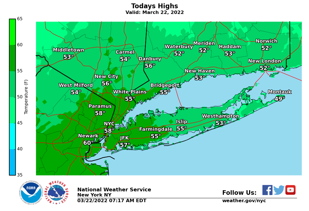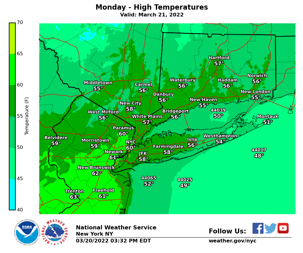 High pressure over the region will provide another dry day for the local area. A northwesterly wind however will keep max temperatures in the 50s. Dry on Wednesday, then rain for Thursday. For all the details visit http://www.weather.gov/nyc