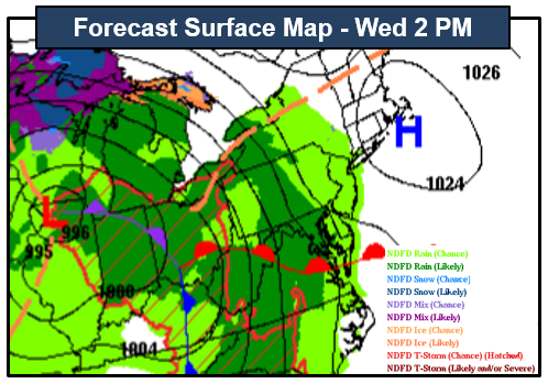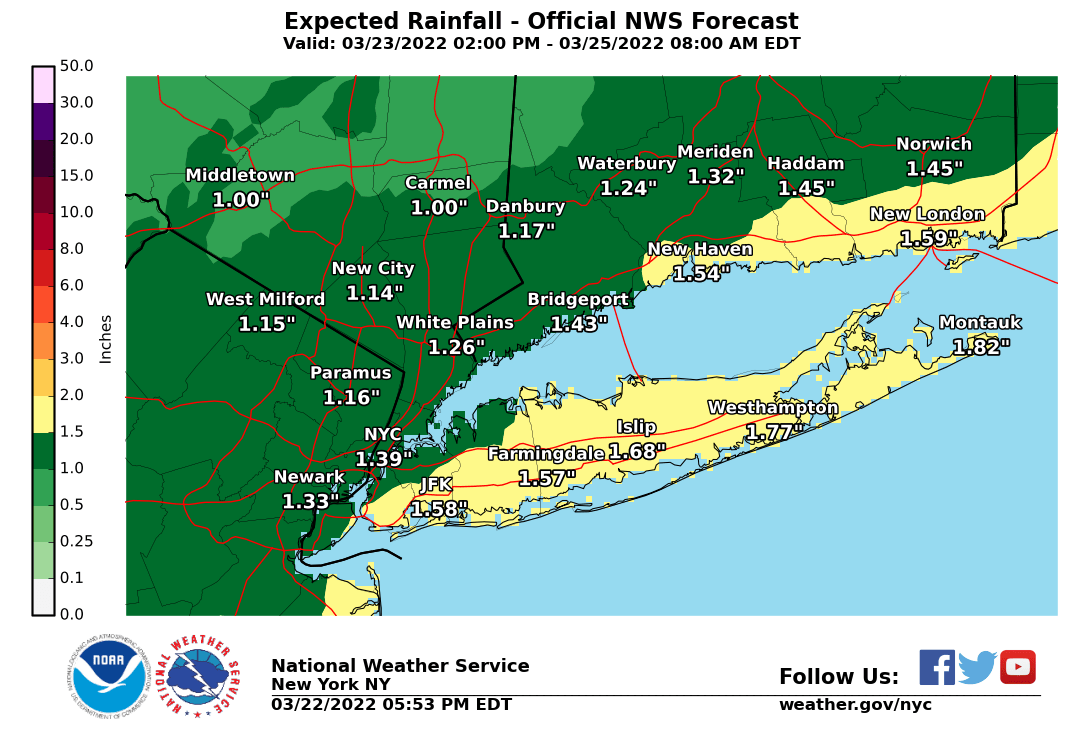 After a dry start on Wednesday, a frontal system approaches and will bring rain to the area. Rain chances start as early as Wednesday afternoon for northeast NJ and NYC. Wet conditions will last through Friday morning and 1 to 2 inches of rainfall is expected.