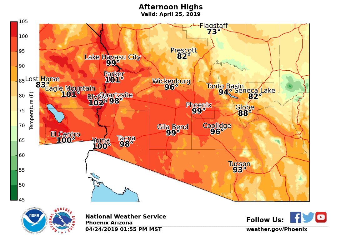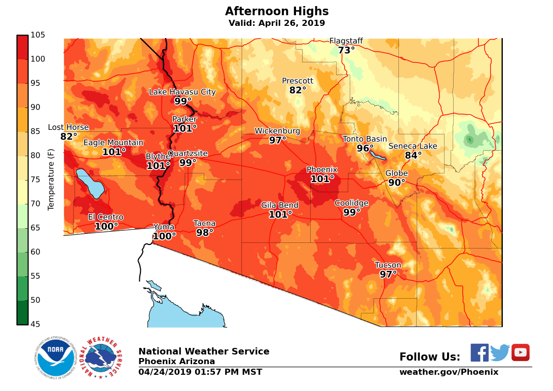 #Phoenix having its first 100+ degree day of 2019, our forecast high of 101° would tie a record high for today and bring moderate heat risk to large sections of the metro valley. Take appropriate heat safety precautions to keep your Friday happy.#AZWXpic.twitter.com/UCZrkfcoQy