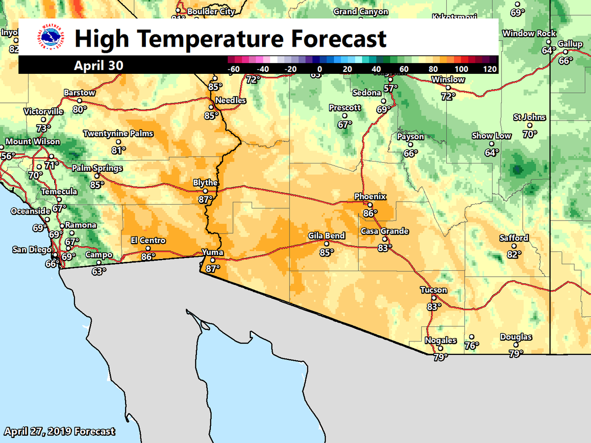 Temperatures continue their upward climb Thursday. A lot of desert locations will likely see their first 100 degree day before the weekend. While temperatures start to trend down over the weekend, still looking at 90s. Be smart about outdoor activities!