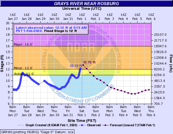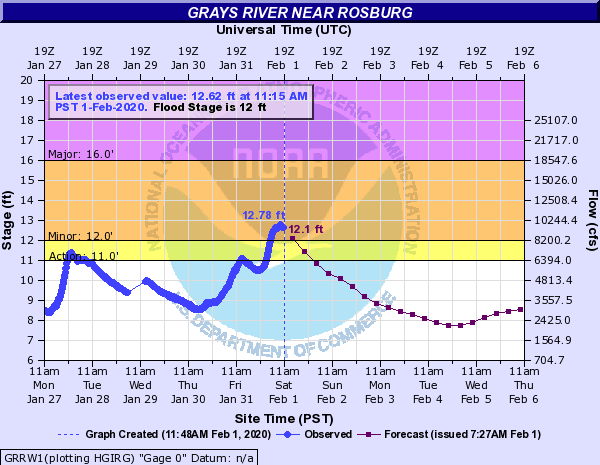 The Grays River in Wahkiakum Co. rose sharply this morning. It's just over flood stage (12 feet) and will crest near 13 feet later this morning. There are likely some roads flooded near the river. Don't drive into flooded areas.