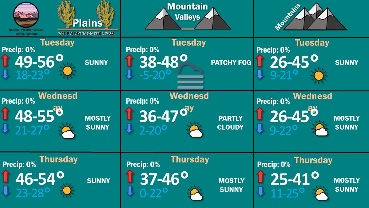 Weather will be fairly quiet again on Wednesday, with mostly clear skies and warm temperatures. Some light snow could hit our eastern mountains and adjacent plains Wednesday night. The next system is expected to hit the area this weekend.